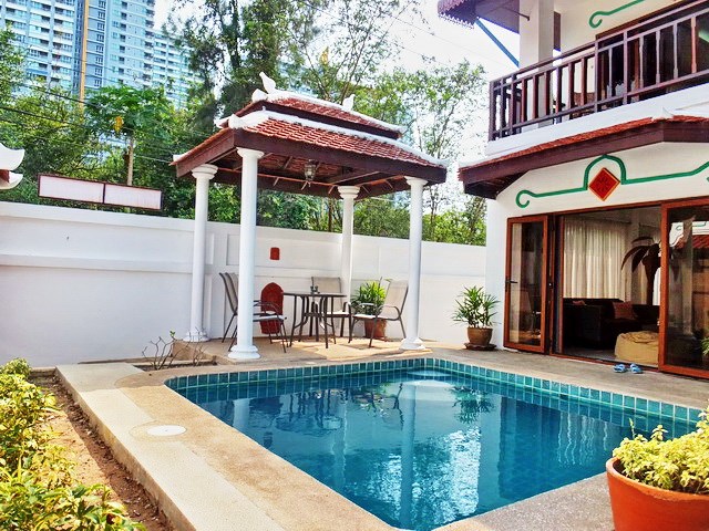 PATTAYA REAL ESTATE: Jombali Pool Villa for sale Jomtien, House for sale Jomien Beach with pool, land size 200 sqm, living area 208 sqm, 3 bedrooms, 3 bathrooms, fully furnished, private pool, terrace, sala, 24-7 security