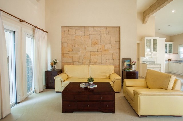 Living area with sofa set, coffee table, TV cabinet with TV