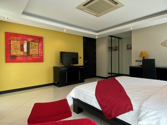 Fourth bedroom suite with full bedroom furniture¸ built-in wardrobes and media cabinet and flat screen TV.